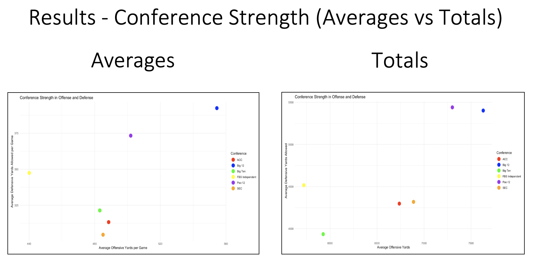 Conference variations reveal strategic and stylistic differences in approaches to the game. SEC and ACC consistently produce the most playoff-ready statistical profiles with balanced excellence. Total statistics analysis provided clearer separation between conferences than averages, further validating their superiority as predictors.