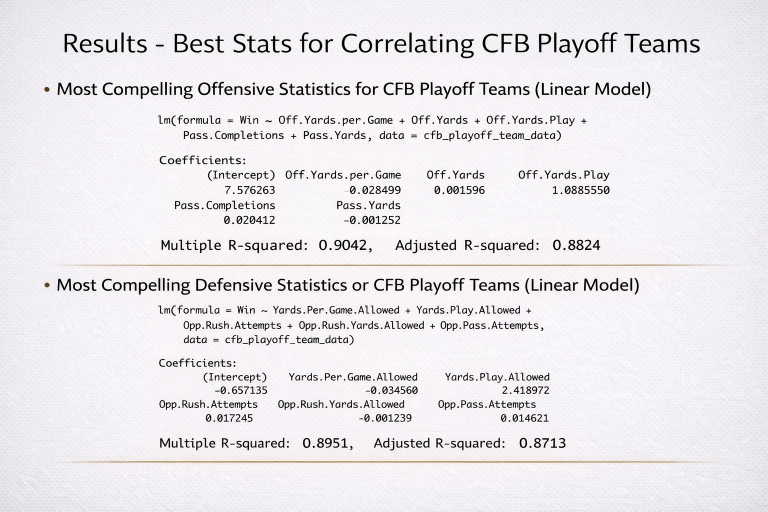 Applied linear regression models to identify key offensive and defensive statistics correlating with CFB Playoff success. Used R's step function to optimize model fit and calculated R-squared values to measure predictive accuracy.