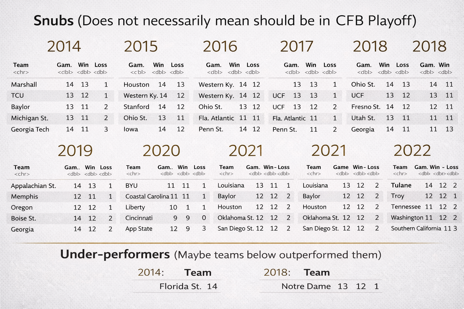 Teams that made the CFB Playoff but scored below the average of that year's statistical snubs were classified as underperformers. If a team scored below average offensively and above average defensively (indicating weaker defense - remember higher defensive stats are worse), they were considered statistical underperformers.